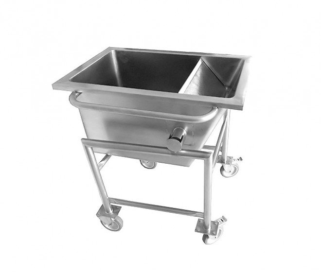 Carro em inox para lavagem de cereais, com cuba basculante e tela.