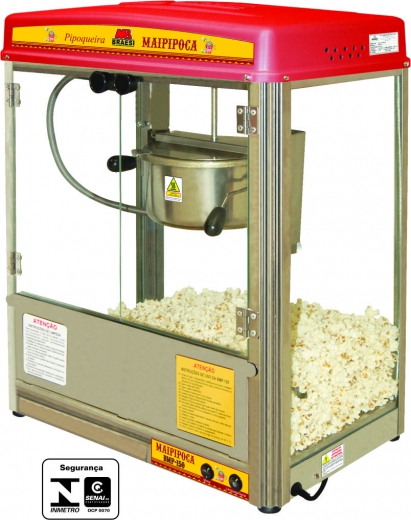 – Panela basculante em aço cromado com tampa em inox, parte interna em alumínio, com capacidade para 150g de milho de pipoca;