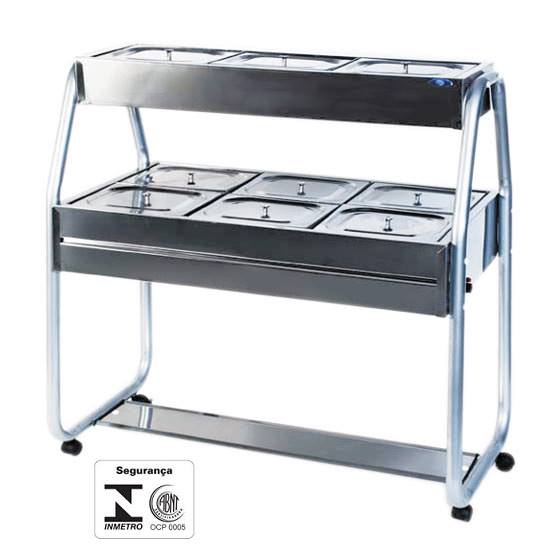 Construído em aço inox brilhante AISI430, cubas gastronômicas (GNs) em aço inox AISI304, estrutura tubular com pintura eletrostática, rodízios com trava.